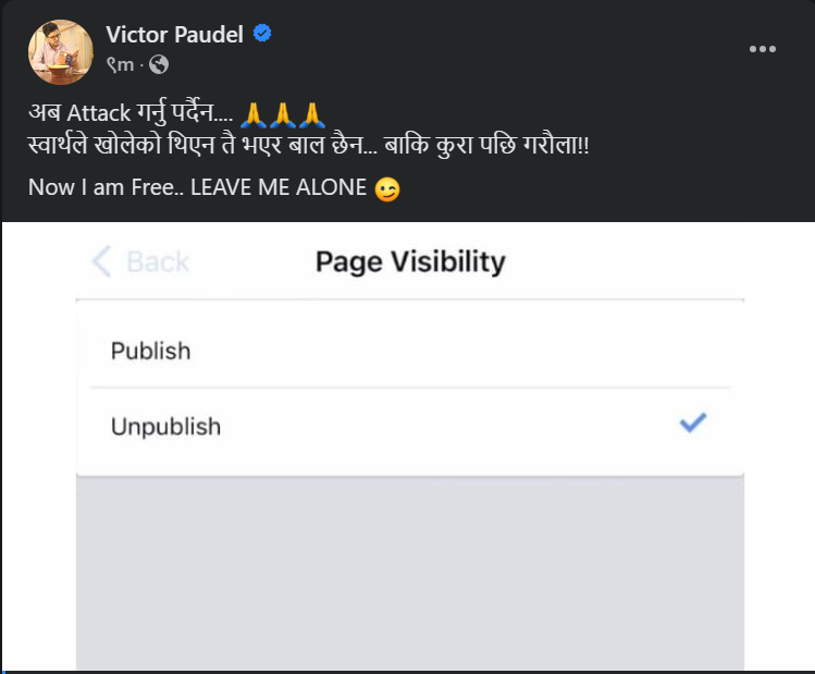 पेजका सञ्चालक भिक्टर पौडेलले आफ्नो सामाजिक सञ्जालमार्फत पेज बन्द गरेको बताएका छन् । उनले लेखेका छन्, अब अट्याक गर्नु पर्दैन, स्वार्थले खोलेको थिएन तै भएर बाल छैन।… बाँकि कुरा पछि गरौला!’