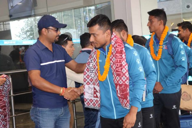 एसिया कप खेलेर स्वदेश फर्केको टोलीलाई आज विमानस्थलमा सशस्त्र प्रहरीको ब्याण्डले बाजागाजासहित स्वागत गरेको हो । खेलाडीहरुको स्वागत गर्न पुगेका समर्थकहरुले विमानस्थलमा समर्थन गर्दै नाराबाजी लगाएका थिए ।