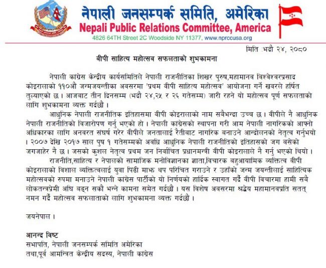 नेपाली जनसम्पर्क समिति अमेरिकाद्वारा बिपी साहित्य महोत्सव सफलताको शुभकामना