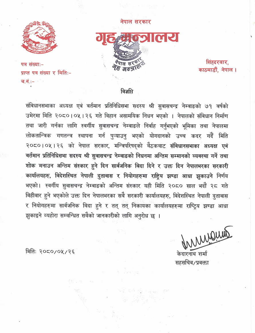 काठमाडौं । नेकपा एमालेका उपाध्यक्ष तथा संविधानसभा अध्यक्ष सुवासचन्द्र नेम्वाङको बिहीबार अन्त्येष्टि गरिने भएको छ ।  नेम्वाङको निधनको शोकमा सरकारले बिहीबार सार्वजनिक बिदा दिएको छ ।
