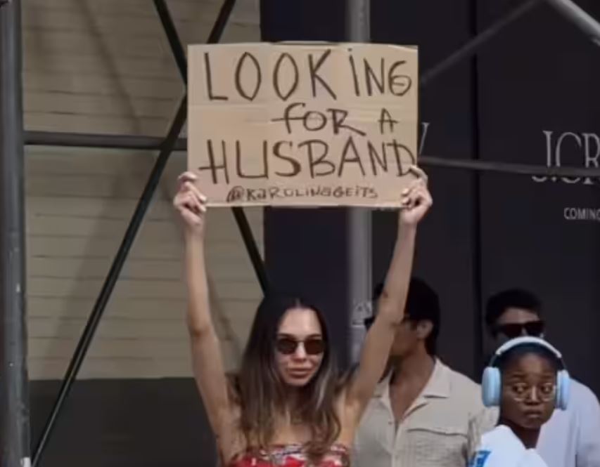 महिलाले हातमा प्लेकार्ड बोकेकी छिन्। जसमा लेखिएको छ, ‘पति खोज्दैछु।’ यसबाहेक उनले आफ्नो इन्स्टाग्राम अकाउन्ट पनि प्लेकार्डको तल दिएका छन्। यो अनौठो विधि देखेपछि त्यहाँबाट जाने हरेक मानिस रोकिन्छन् र हेर्छन्।