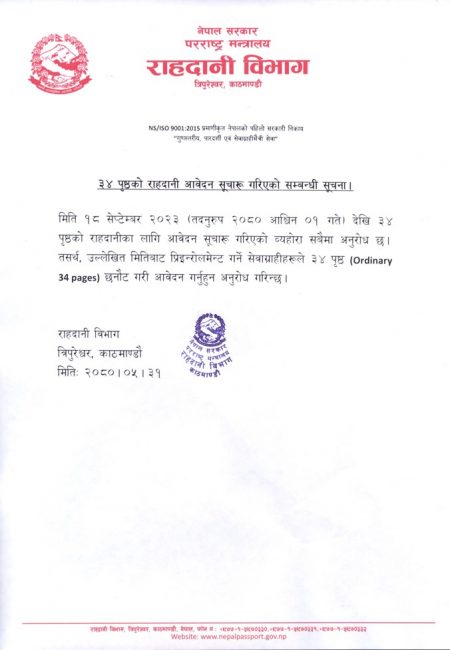 यसबारे आइतबार नै सूचना जारी गरेर विभागले सोमबारबाट ३४ पृष्ठको राहदानीका लागि आवेदन दिन सकिने जानकारी दिएको थियो।