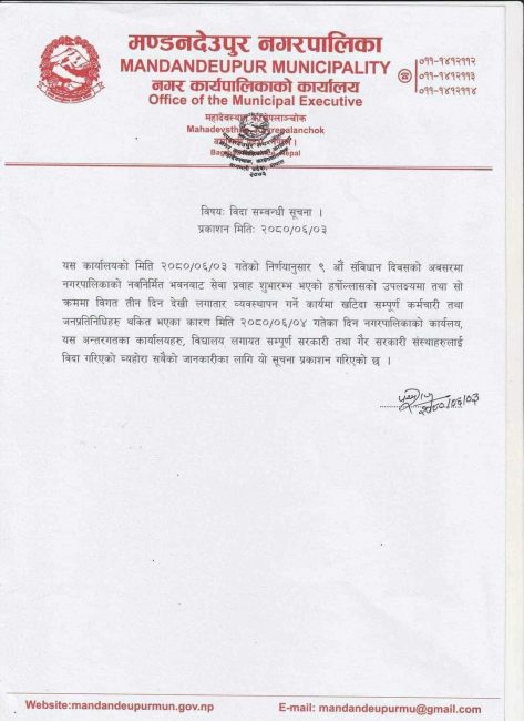 ‘बिगत तीन दिनदेखिलगातार ब्यबस्थापन गर्ने कार्यमा खटिँदा सम्पूर्ण कर्मचारी तथा जनप्रतिनिधिहरु थकित भएका कारण मिति २०८० असोज ४ गते दिन नगरपालिकाको कार्यालय, यस अन्तरगतका कार्यालयहरु, बिद्यालय लगायत सम्पुर्ण सरकारी तथा गैर सरकारी संस्थाहरुलाई बिदा गरिएको ब्योहोरा सबैको जानकारीका लागि यो सुचना प्रकाशन गरिएको छ,’ जारी बिज्ञप्तिमा भनिएको छ।