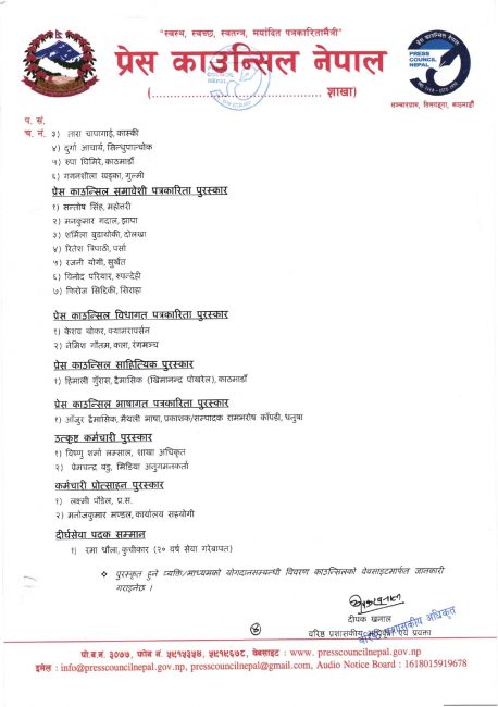 काउन्सिलले डिसी नेपालका प्रधान सम्पादक चूडामणि भट्टराई र समाचार सम्पादक मदन कोइरालालाई पुरस्कार दिने निर्णय गरेको छ। प्रधान सम्पादन भट्टराईलाई प्रेस काउन्सिल सशक्त सञ्चारकर्मी पुरस्कार र समाचार सम्पादक कोइरालालाई प्रेस काउन्सिल युवा पत्रकारिता पुरस्कार प्रदान गर्ने निर्णय गरेको छ।