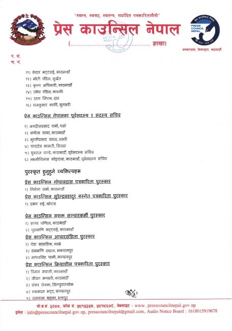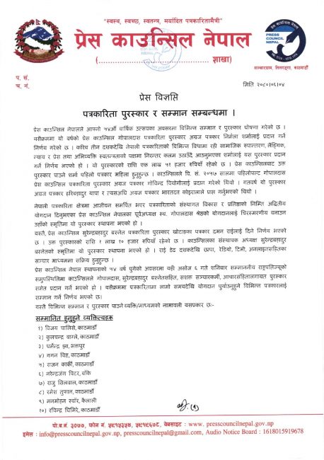 यसैगरी काउन्सिलले यो वर्षको गोपालदास पत्रकारिता पुरस्कार पत्रकार निर्मला शर्मालाई प्रदान गर्ने निर्णय गरेको छ। सो पुरस्कार पाउने शर्मा पहिलो महिला पत्रकार हुन्। उक्त पुरस्कारको राशी एक लाख ५१ हजार रहेको छ।