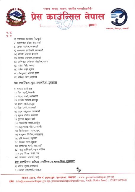 काठमाडौं। प्रेस काउन्सिलले आफ्नो ५४ औं वार्षिकोत्वसको अवसरमा विभिन्न सम्मान र पुरस्कारको घोषणा गरेको छ।