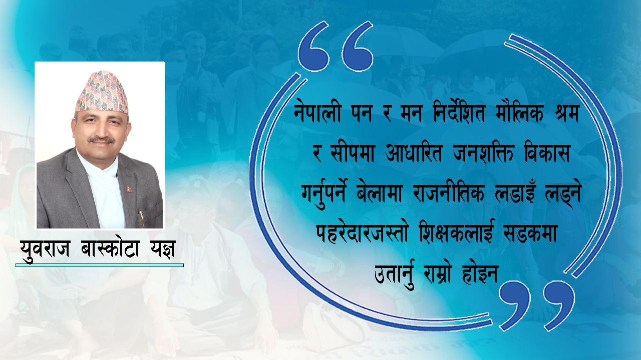 स्थिति के हो भने शिक्षा–शिक्षणको मेरुदण्ड शिक्षक वर्गको माग सम्बोधन र व्यवस्थापन नगरी शिक्षाको अपेक्षित ज्योति फैलाउन सकिँदैन । यतिबेला शिक्षकको मन दुखाएर गुणस्तरीय शिक्षा हासिल गर्न सकिँदैन । नेपाली पन र मन निर्देशित मौलिक श्रम र सीपमा आधारित जनशक्ति विकास गर्नुपर्ने बेलामा राजनीतिक लडाइँ लड्ने पहरेदारजस्तो शिक्षकलाई सडकमा उतार्नु राम्रो होइन।