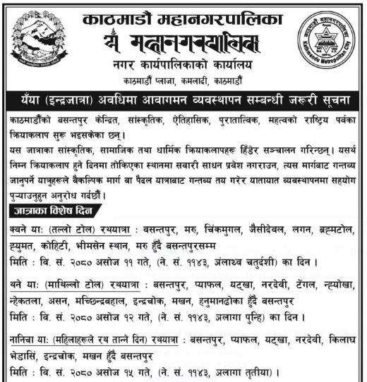 काठमाडौं महानगरपालिकाले सूचना जारी गर्दै काठमाडौंको बसन्तपुर केन्द्रित सांस्कृतिक, ऐतिहासिक, पुरातात्विक महत्वको पर्व भएका कारण सवारी साधन प्रवेशमा रोक लगाइएको बताएको छ।