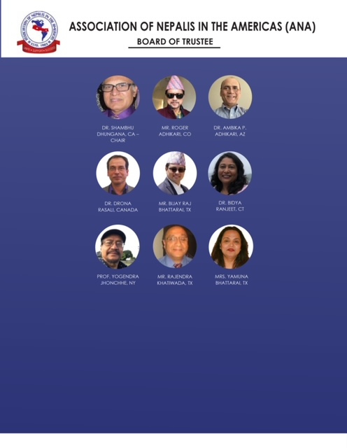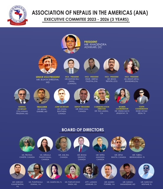 Association of Nepalis in the Americas (ANA) को २०२३-२०२६ अर्थात् आगामी ३ बर्षे कार्यकालको लागि ए.एन.ए. को अध्यक्ष पदमा श्री खगेन्द्र अधिकारी एवं अन्य बिभिन्न व्यक्तित्वहरु बिभिन्न पदमा निर्वाचित भै सकेको सार्वजनिक समाचार यो भन्दा पहिला पनि संप्रेषित भए पश्चात हालै मात्र अध्यक्ष अधिकारीको नेतृत्वमा रहेको वर्तमान कार्यसमितिको नियमित तथा पूर्ण बैठकको सर्वसम्मत निर्णय बाट ए.एन.ए. Bylaws बमोजिमको निर्देशित बिधि अनुसार आफ्नो उर्जनसिल जीवनमा बिभिन्न महत्वपूर्ण बिषयहरुमा विज्ञता हाँसिल गर्नु भएका ख्याति प्राप्त उपाधि आर्जित, विद्वत् संग-संगै योग्य, क्षमतावान, विद्यमान समुदायका होनहार साथ-साथै हाम्रो समाजका प्रतिष्ठित अनि मर्मस्पर्शी सामाजिक सेवाको निःस्वार्थ भावनामा निरन्तर लागिपरेर आफ्नो सार्वजनिक जीवनमा समाजको सामु ऐना यानेकी दर्पण छायाँ झै मानिसहरुलाई अनुभूति हुँने गरी योगदान पुर्याई यस महत्वपूर्ण सोचमा सुलभ तवर बाट सफलता प्राप्त गर्न उदाहरण बन्नु भएका निम्नलिखित तपसिलमा उल्लेखित बरिष्ट समाजसेवी व्यक्तित्वहरु ए.एन.ए. कार्यसमितिको हालै सम्पन नियमित र पूर्ण बैठकमा उपस्थित बहुत प्राप्त पदाधिकारीहरूको सर्वसम्मत, प्रजातांत्रिक, लोकतांत्रिक, र बिधिवत निर्णयको निर्विरोध नतीजा बाट सर्वसम्मतिमा निर्वाचित (मनोनित) हुनु भएको र अध्यक्ष अधिकारीको अध्यक्षमा सम्पन्न उक्त संस्थागत र सम्मानित कार्यसमितिको महत्वपूर्ण एवं प्रजातांत्रिक आन्तरिक निर्वाचन व्यवस्था अनुसार सम्पन बैठकको सर्वसम्मत पदस्थापनको निर्णय पश्चात यस संस्थाको २०२३- २०२६ अर्थात् तिन बर्षे कार्यकालको आंशिक बाहेक सबै पदपूर्तिको कार्य पुरा भएको छ।
