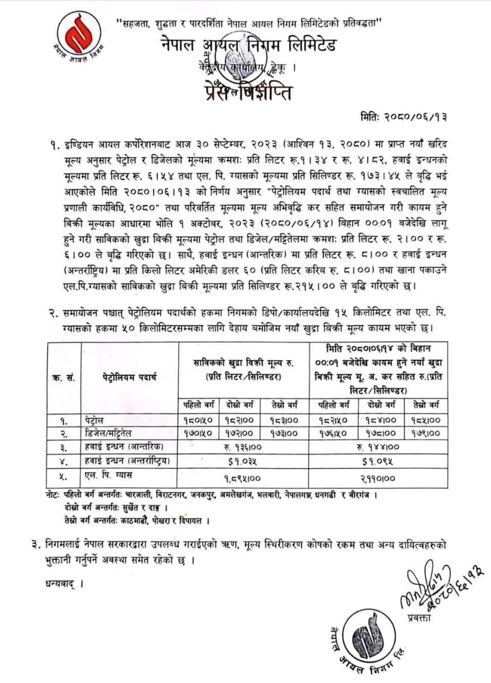 निगमले आज रातिदेखि लागू हुने गरी पेट्रोलमा प्रतिलिटर रु २ र डिजेल तथा मट्टितेलमा प्रतिलिटर रु ६ वृद्धि गरेको हो । यस्तै, खानामा पकाउने एलपि ग्यासमा साविकको खुद्रा बिक्री मूल्य प्रतिसिलिण्डर २१५ रुपैयाँले वृद्धि गरेको निगमले जनाएको छ। । त्यस्तै हवाइ इन्धन आन्तरिक र अन्तर्राष्ट्रिय दुबैमा प्रतिलिटर ८ रुपैयाँ बढाइएको छ ।