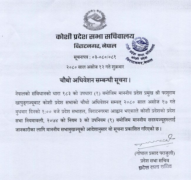 प्रदेश सभा सचिव गोपालप्रसाद पराजुलीका अनुसार नेपालको संबिधानको धारा १८३ उपधारा १ बमोजिम प्रदेश प्रुमख परशुराम खापुङले कोशी प्रदेशसभाको चौंथो अधिवेसन बुधबार १ बजेका लागि बोलाएका हुन् ।
