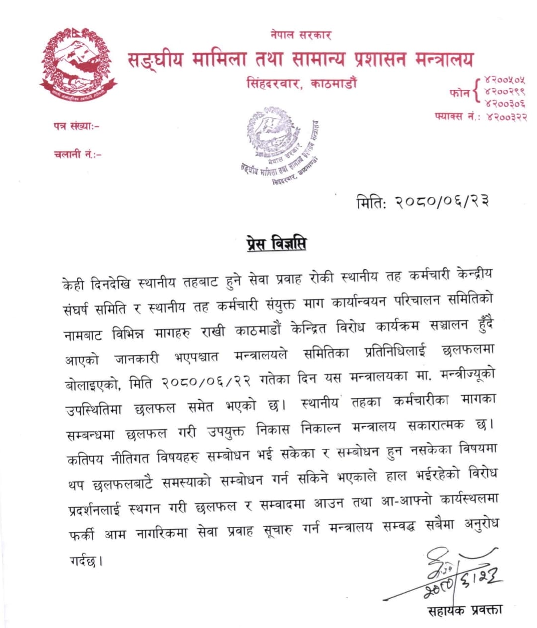 काठमाडौं । सरकारले स्थानीय तहका कर्मचारीलाई वार्ता आउन आह्वान गरेको छ । सङ्घीय मामिला तथा सामान्य प्रशासन मन्त्रालयले आज एक विज्ञप्ति जारी गरी आन्दोलनरत कर्मचारीका मागको छलफलबाटै सम्बोधन हुने भएकाले वार्तामा आउन आह्वान  गरेको हो ।