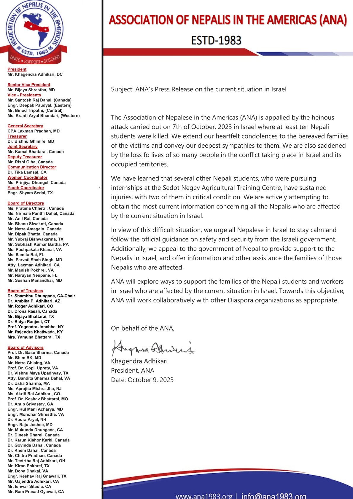 अध्यक्ष अधिकारीले प्रेस विज्ञप्ति जारी गर्दै इजरायलमा रहेका नेपाली नागरिकहरूको अवस्थाबारे चासो व्यक्त गरेका छन् । साथै उनले इजरायलमा हमासको आक्रमणमा परी मृत्यु भएका नेपाली विद्यार्थीहरूप्रति भावपूर्ण श्रद्धाञ्जली व्यक्त गर्दै उनीहरूको परिवारप्रति सहानुभूति समेत प्रकट गरेका छन्।