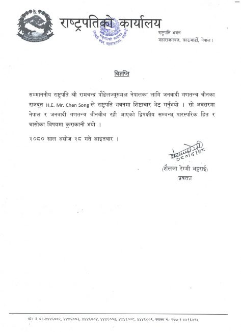 राष्ट्रपति पौडेलसँग चीनका राजदूतले गरे शिष्टाचार भेट