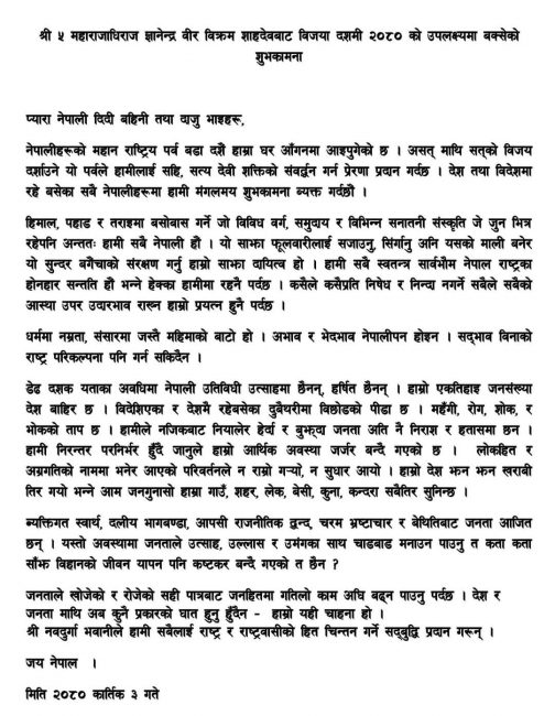 विजया दशमीकाे अवसरमा शुभकामना सन्देश जारी गर्दै पूर्वा राजा ज्ञानेन्द्रले डेढ दशक यताका अवधिमा नेपालीमा उत्साहमा छैनन् र हर्ष नभएकाे उल्लेख गर्दै व्यक्तिगत स्वार्थ, दलीय भागबण्डा, आपसी राजनीतिक द्वन्द्व, चरम भ्रष्टाचार र बेथितिबाट जनता आजित भएकाे बताएका छन्।
