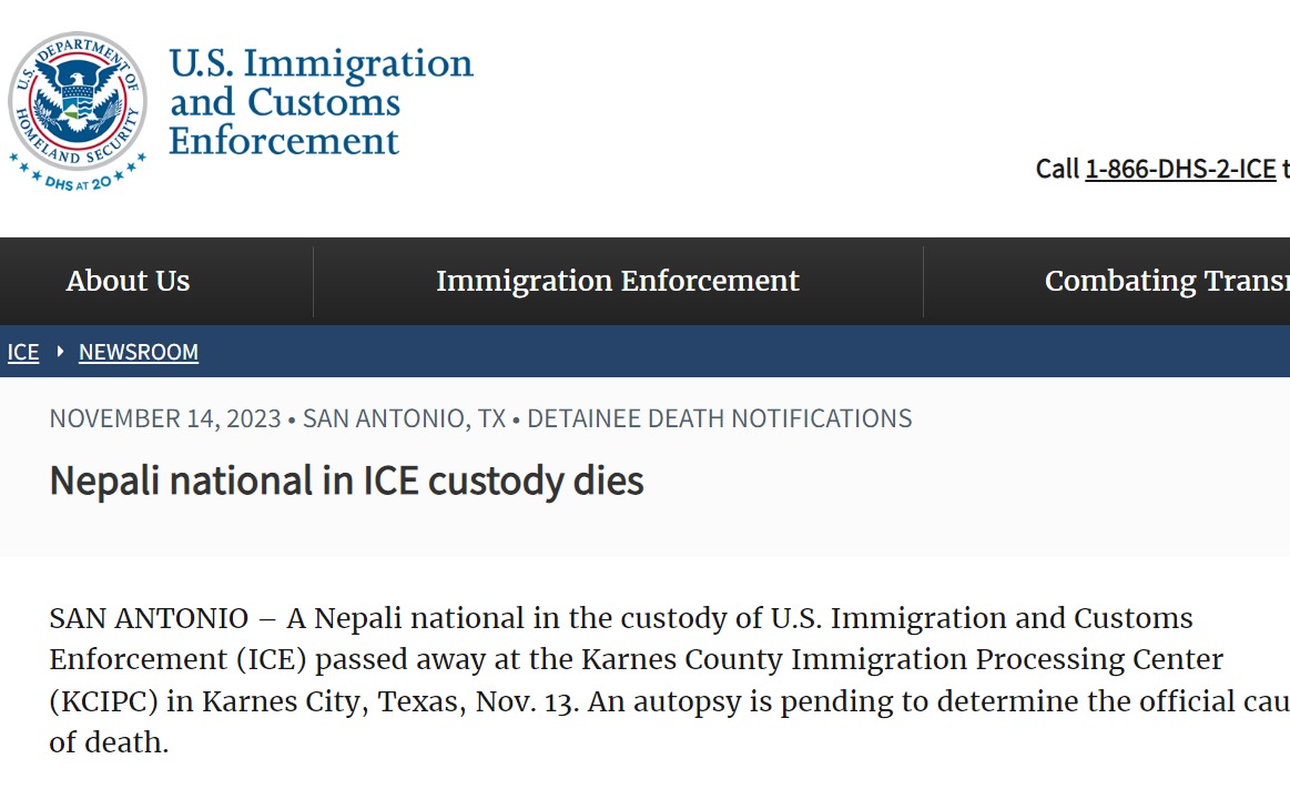 अमेरिकी अध्यागमनको हिरासतमा रहेका नेपाली युवाको निधन