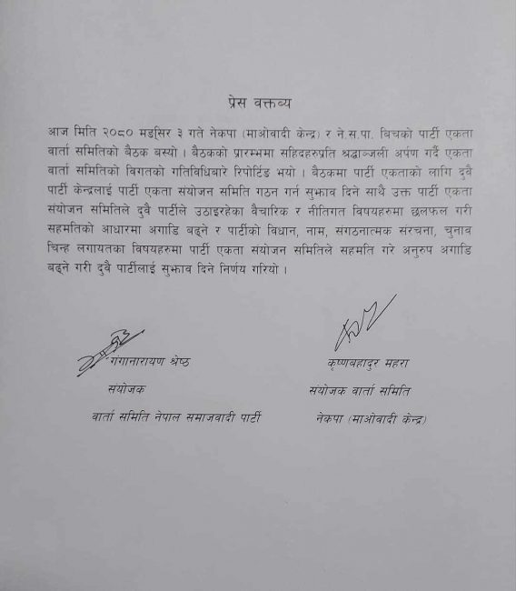 बैठकपछि माओवादी केन्द्रका तर्फबाट वार्ता समितिका संयोजक कृष्णबहादुर महरा र नेपाल समाजवादी पार्टीका संयोजक गङ्गानारायण श्रेष्ठले संयुक्त विज्ञप्ति जारी गरेका छन्। बैठकमा माओवादी केन्द्रका महासचिव देवप्रसाद गुरुङ, नेपाल समाजवादी पार्टीका नेताहरु दुर्गा सोवलगायतको उपस्थिति थियो।