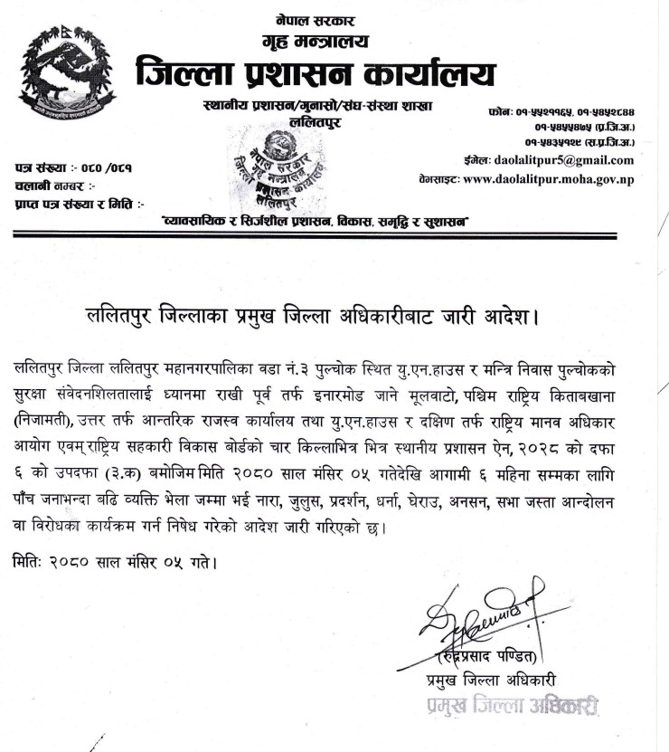 प्रजिअ पण्डितद्वारा हस्ताक्षरित आदेशमा भनिएको छ, ‘ललितपुर जिल्ला ललितपुर महानगरपालिका वडा नं। ३ पुल्चोक स्थित यु.एन. हाउस र मन्त्रि निवास पुल्चोकको सुरक्षा संवेदनशिलतालाई ध्यानमा राखी पूर्व तर्फ इनारमोड जाने मूलवाटो, पश्चिम राष्ट्रिय किताबखाना (निजामती), उत्तर तर्फ आन्तरिक राजस्व कार्यालय तथा यु।एन। हाउस र दक्षिण तर्फ राष्ट्रिय मानव अधिकार आयोग एवम् राष्ट्रिय सहकारी विकास बोर्डको चार किल्लाभित्र भित्र स्थानीय प्रशासन ऐन, २०२८ को दफा ६ को उपदफा (३.क) बमोजिम मिति २०८० साल मंसिर ०५ गतेदेखि आगामी ६ महिना सम्मका लागि पाँच जनाभन्दा बढि व्यक्ति भेला जम्मा भइ नारा, जुलुस, प्रदर्शन, धर्ना, घेराउ, अनसन, सभा जस्ता आन्दोलन वा विरोधका कार्यक्रम गर्न निषेध गरेको आदेश जारी गरिएको छ।’
