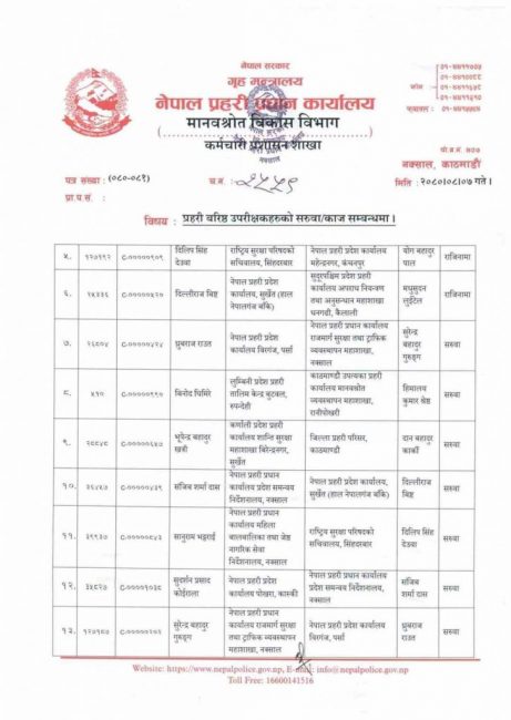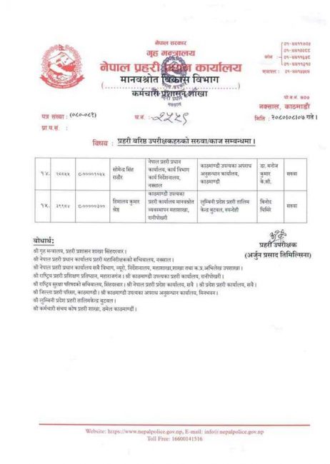 यस अघि जिल्ला परिसर काठमाडौंको प्रमुखमा काजमा खटाइएका भुपेन्द्रबहादुर खत्री, काठमाडौं उपत्यका अपराध अनुसन्धान कार्यालयमा काजमा खटाइएका सोमेन्द्रसिंह राठौर र प्रहरी प्रधान कार्यालय महिला, बालबालिका तथा जेष्ठ नागरिक निर्देशनालयमा काजमा खटाइएका डा.मनोजकुमार केसीलाई काजमै खटाइएको ठाउँमा सरुवा गरेको छ भने प्रहरी प्रधान कार्यालय प्रहरी महानिरीक्षको सचिवालयलमा काजमा खटाइएका दानबहादुर कार्कीको कर्णाली प्रदेश प्रहरी कार्यालय शान्ति सुरक्षा महाशाखामा सरुवा गरेको छ।