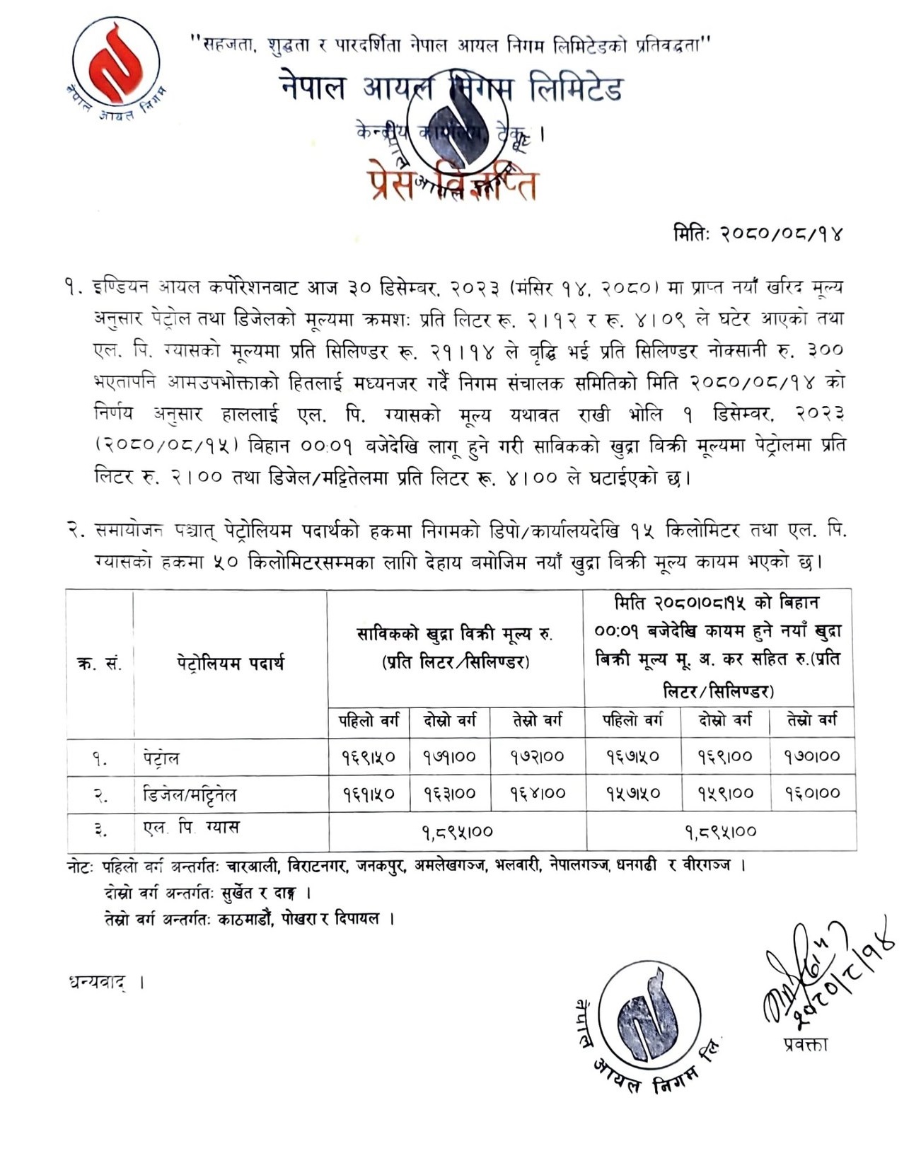 निगमले पहिलो, दोस्रो र तेस्रो वर्गका क्षेत्रमा पेट्रोलको मूल्य प्रतिलिटर क्रमश: एक सय ६७ रुपैयाँ ५० पैसा, एक सय ६९ रुपैयाँ र एक सय ७० रुपैयाँ तोकेको छ । यस्तै पहिलो, दोस्रो र तेस्रो वर्गका क्षेत्रमा डिजेल/मट्टितेलको मूल्य प्रतिलिटर क्रमशः एक सय ५७ रुपैयाँ ५० पैसा, एक सय ५९ रुपैयाँ र एक सय ६० रुपैयाँ कायम गरेको छ ।