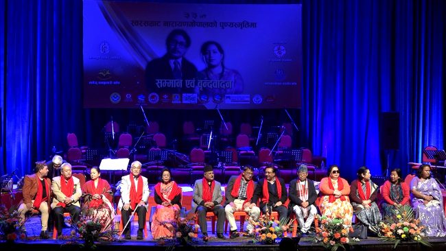 काठमाडौं। स्वरसम्राट नारायण गोपाल गुरुवाचार्यको ३३ औँ स्मृति दिवसका अवसरमा स्वर किन्नरी तारादेवी (मरणोप्रान्त) र संगीतकार गणेश रसिक (राई)लाई सम्मान गरिएको छ।