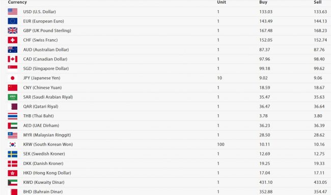 अमेरिकी डलरको खरिद दर १३३ रुपैयाँ ०३ पैसा र बिक्री दर १३३ रुपैयाँ ६३ पैसा रहेको छ । आज युरो एकको खरिद दर १४३ रुपैयाँ ४९ पैसा र बिक्री दर १४४ रुपैयाँ १३ पैसा रहेको छ।