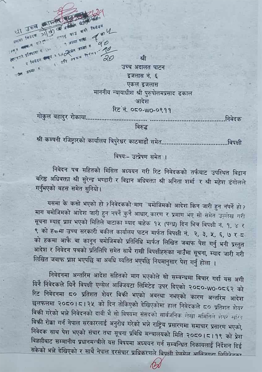 काठमाडौं । उच्च अदालत पाटनले एनसेलको सेयर खरिद बिक्री रोक्न अल्पकालीन आदेश जारी गरेको छ । गोकुलबहादुर रोकायाले एनसेलको शेयर खरिदबिक्रीको कारोबारलाई नेपालभित्र मान्यता नदिन माग गर्दै दायर गरेको रिटमा न्यायाधीश पुरुषोत्तमप्रसाद ढकालको इजलासले कम्पनी रजिस्ट्रार कार्यालयका नाममा आदेश जारी गरेको हो ।
