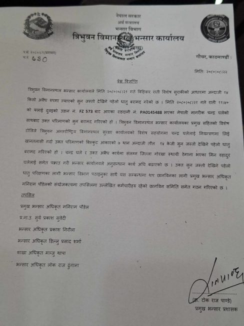 काठमाडौं। त्रिभुवन अन्तर्राष्ट्रिय विमानस्थलबाट बिहीबार राति बरामद १४ किलो सुन छानबिन गर्न भन्सार विभागले ६ सदस्यीय छानबिन समिति गठन गरेको छ।