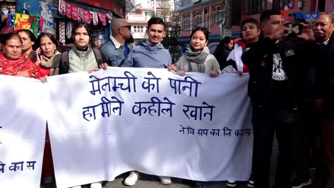 लामो समय हुँदा पनि मेलम्ची खानेपानी उपलव्ध हुन नसकेको भन्दै नेविसंघ काठमाडौं जिल्ला कार्यसमितिले काठमाडौंमा प्रदर्शन गरेको हो। प्रदर्शनमा सहभागीहरुले मेलम्चीको पानी हामीले कहिले खाने, मेलम्चीको पानीमा भ्रष्टाचार बन्द गर, लगाएतका प्ले कार्य प्रदर्शन गरेका थिए।