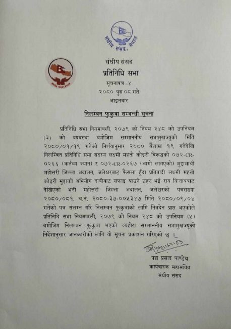 संघीय संसद्का कार्यवाहक महासचिव पद्मप्रसाद पाण्डेयले सांसद कोइरीको निलम्बन फुकुवा भएको सूचना सभामुख घिमिरेको निर्देशनमा आइतबार जारी गरेका हुन्।