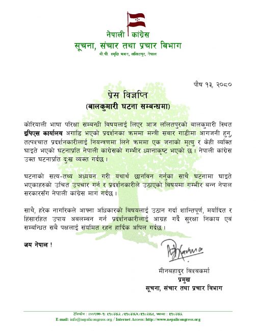 `कोरियाली भाषा परिक्षा सम्बन्धी विषयलाई लिएर आज ललितपुरको बालकुमारी स्थित इपिएस कार्यालय अगाडि भएको प्रदर्शनका क्रममा मन्त्री सवार गाडीमा आगजनी हुनु, तत्पश्चात प्रदर्शनकारीलाई नियन्त्रणमा लिने क्रममा एक जनाको मृत्यु र केही व्यक्ति घाइते भएको घटनाप्रति नेपाली कांग्रेसको गम्भीर ध्यानाकृष्ट भएको छ,` कांग्रेसले जारी गरेको बिज्ञप्तिमा भनिएको छ, `नेपाली कांग्रेस उक्त घटनाप्रति दुःख व्यक्त गर्दछ ।´
