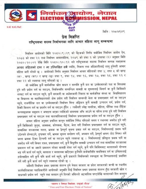 ‘निर्वाचन आयोगको आइतबार बसेको बैठकको निर्णय बमोजिम निर्वाचन आयोग ऐन, २०७३ को दफा २२ तथा निर्वाचन आचारसंहिता, २०७९ को दफा १ को उपदफा (२) अनुसार मिति २०८०।१०।०२ देखि मिति २०५०।१०।१२ गते राष्ट्रियसभा सदस्य निर्वाचन सम्पन्न नभएसम्म आचारसंहिताको दफा १ मा उल्लिखित सबै व्यक्ति, निकाय तथा अधिकारीलाई लागू हुनेगरी आचार संहिता जारी गरेको छ,’ प्रवक्ता पौडेलले जारी गरेको विज्ञप्तिमा भनिएको छ ।