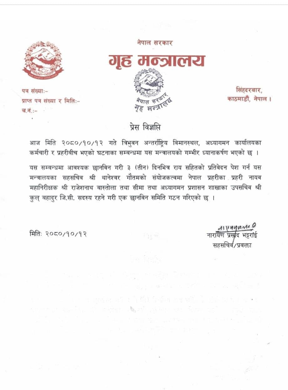 विमानस्थलमा प्रहरीबाट अध्यागमनका कर्मचारी कुटिएको विषयमा छानबिन गर्न समिति गठन