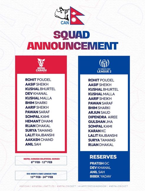 क्यानडाविरुद्धको सिरिज तथा लिग-२ खेल्ने राष्ट्रिय क्रिकेट टिमको घोषणा