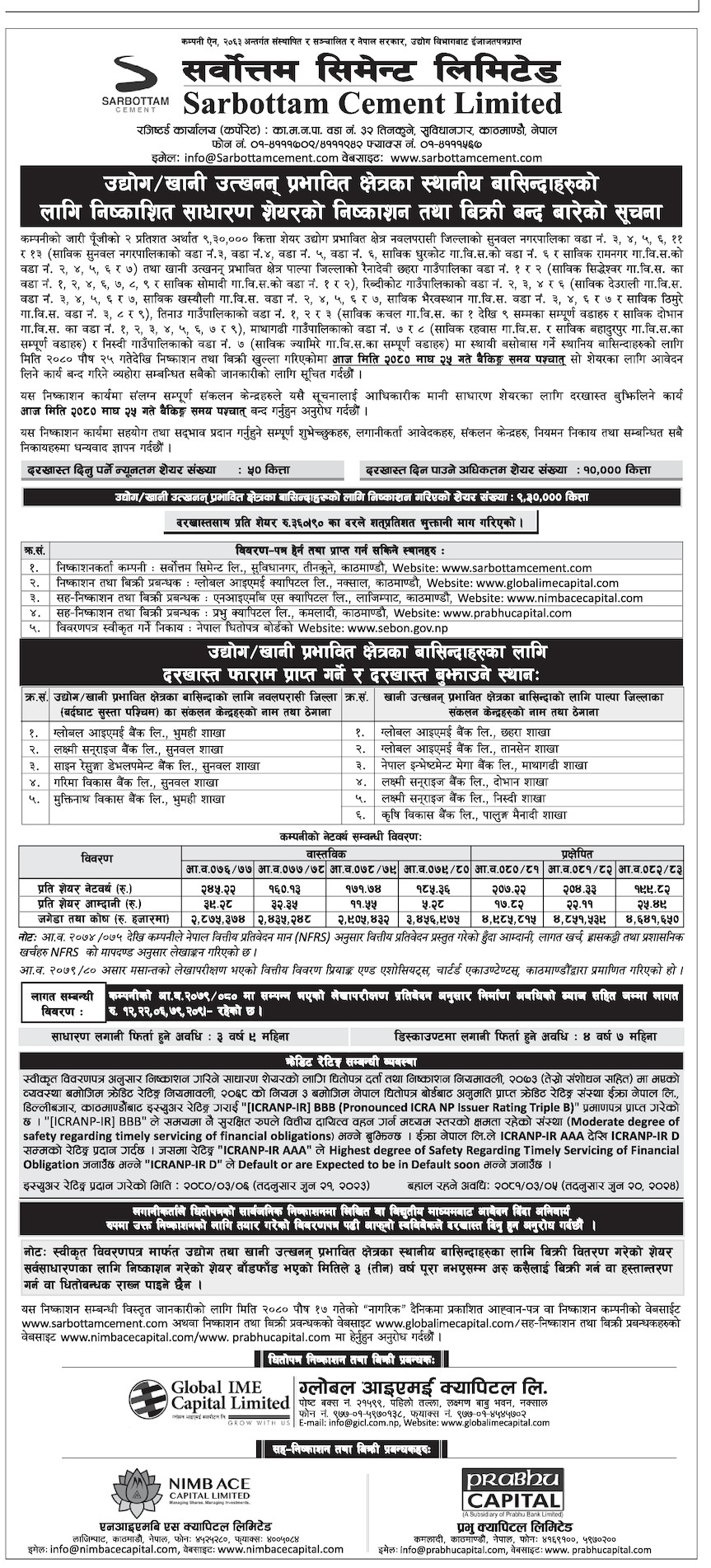 सर्वोत्तम सिमेन्टले पहिलो पल्ट बुक बिल्डिङ विधिबाट आइपीओ जारी गरेको हो। उक्त आइपीओ उद्योग प्रभावित क्षेत्रका स्थानीय बासिन्दाहरुका लागि खुला गरिएको थियो सोही आइपीओमा आवेदन दिने आज अन्तिम दिन रहेकोले आवेदकले आज कार्यालय समयभित्र आवेदन दिनसक्ने छन। स्थानीय बासिन्दाका लागि ९ लाख ३० हजार कित्ता बिक्रीमा ल्याएको हो।