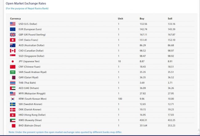 आज अमेरिकी डलरको खरिद दर १३२ रुपैयाँ ५६ पैसा र बिक्री दर १३३ रुपैयाँ १६ पैसामा कारोबार हुदाँ युरोपियन युरो १ को खरिद दर १४२ रुपैयाँ ७४ पैसा र बिक्री दर १४३ रुपैयाँ ३९ पैसा कायम गरिएको छ।