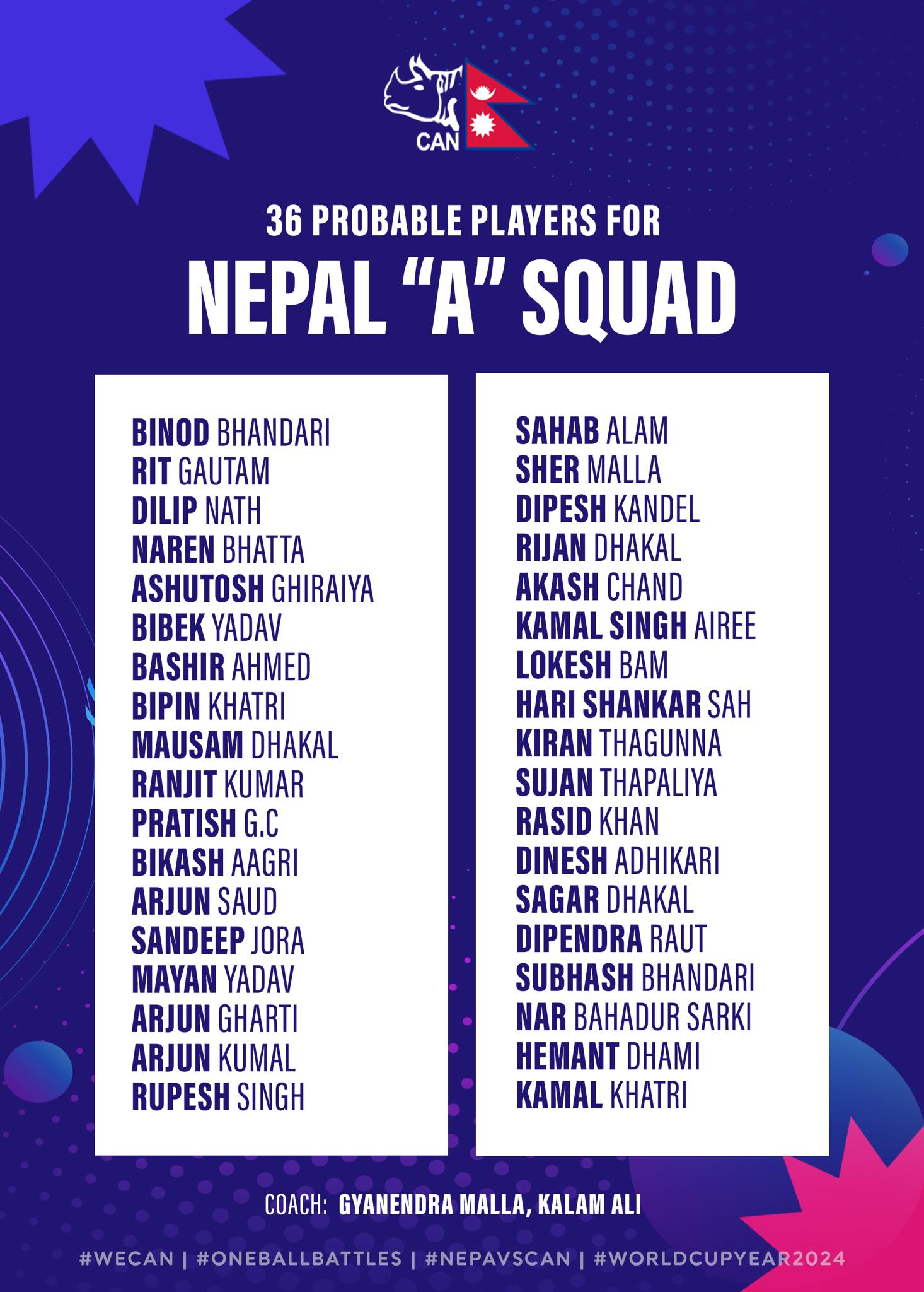 ए टिमका लागि ३६ जनाको सूचीमा बिनोद भण्डारी, रित गौतम, दिलिप नाथ, नरेश भट्ट, आशुतोष घिरोहिया, बिबेक यादव, बशीर अहमद, बिपिन खत्री, मौसम ढकाल, रंजित कुमार, प्रतिस जिसी, विकास आग्री, अर्जुन साउद, सन्दीप जोरा, मयन यादव, अर्जुन घर्ति, अर्जुन कुमाल, रुपेश सिंह, शाहाब आलम, शेर मल्ल, दिपेश कँडेल, रिजन ढकाल, आकाश चन्द, कमल सिंह ऐरी, लोकेश बम, हरि शंकर शाह, किरण ठगुन्ना, सुजन थपलिया, रसिद खान, दिनेश अधिकारी, सगर ढकाल, दिपेन्द्र राउत, सुवाष भण्डारी, नरबहादुर सार्की, हेमन्त धामी र कमल खत्री रहेका छन्।
