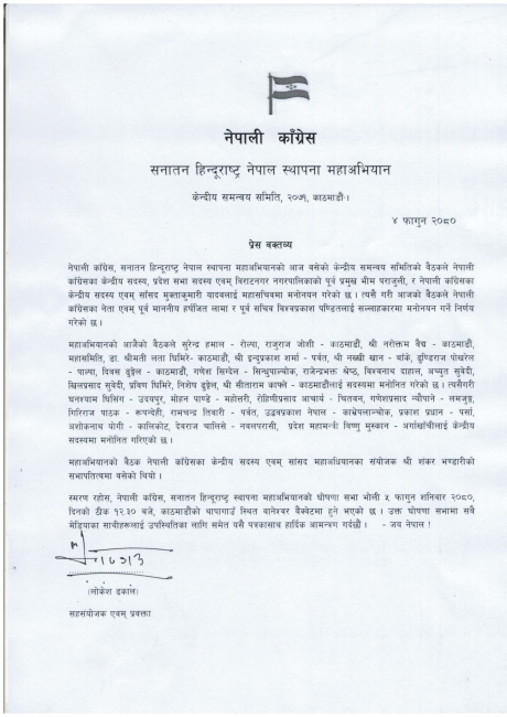 कांग्रेसका केन्द्रीय सदस्यहरूले हिन्दु राष्ट्रको पक्षमा महाअभियान घोषणा गर्दै