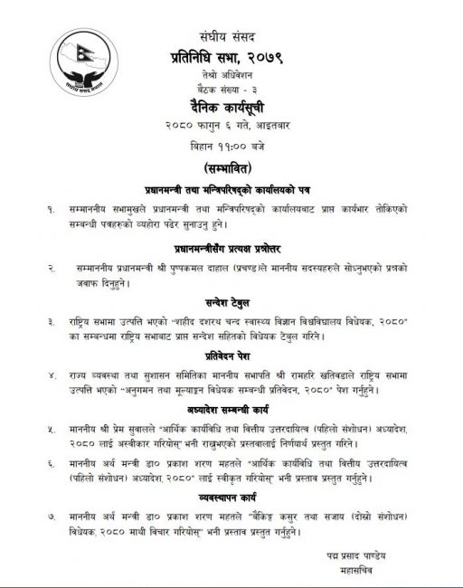 साथै, मन्त्री महतले ‘बैंकिङ कसुर तथा सजायँ (दोस्रो संशाेधन) बिधेयक २०८० माथि बिचार गरियोस’ भन्ने प्रस्ताव प्रस्तुत गर्ने महासचिव पदम प्रसाद पाण्डेयले जारी गरेको सम्भावित कार्यसूचीमा उल्लेख गरिएको छ।