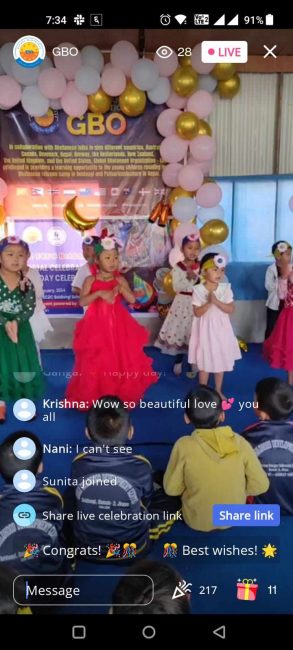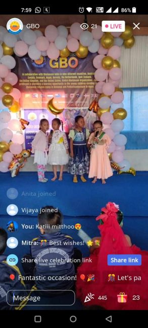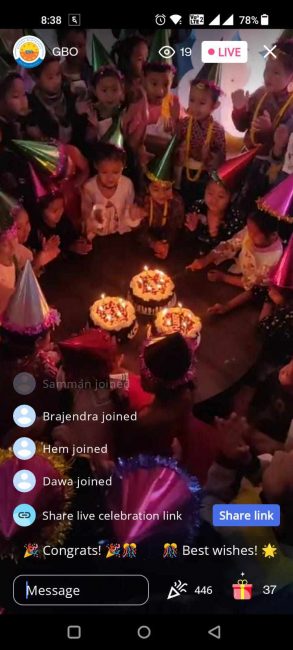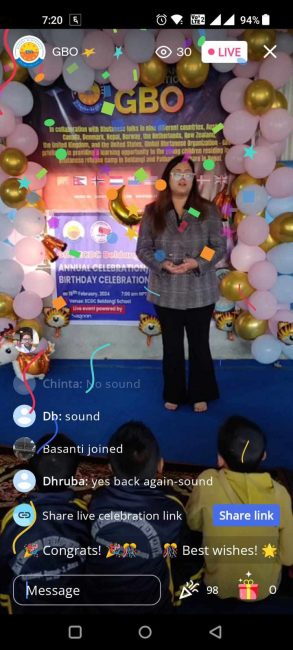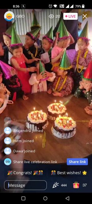 फेब्रुअरी महिनामा जन्मदिन भएका बालविकास केन्द्रमा अध्ययनरत बालबालिकाहरुको सामूहिक जन्मदिन मनाउने कार्यक्रम थियो । ग्लोबल भुटानिज अर्गनाइजेशनको आयोजनामा भएको यो कार्यक्रम सगुन एपको ‘लाइभ सेलिब्रेसन’मार्फत अनलाइनमा प्रत्यक्ष प्रसारण गरिएको थियो । प्रत्यक्ष प्रसारण हेर्नेहरुले अनलाइनबाटै बालबालिकाको लागि उपहार पठाएका थिए ।
