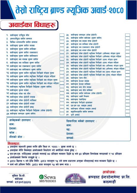 सांगीतिक क्षेत्रका विभिन्न ५१ विधामा प्रदान गरिने अवार्डका लागि फाल्गुण १५ गतेसम्म आवेदन खुला गरिएको कार्यक्रम संयोजक सुनिल विसीले जानकारी दिए।