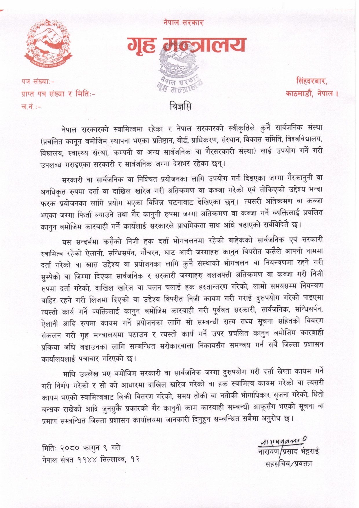 ‘सार्वजनिक एवं सरकारी स्वामित्व रहेको ऐलानी, सन्धिसर्पन, गौचरन, घाट जस्ता जग्गाहरू कानुनविपरीत कसैले आफ्नो नाममा दर्ता गरेको वा खास उद्देश्य वा प्रयोजनका लागि कुनै संस्थाको भोगचलन वा नियन्त्रणमा रहने गरी सुम्पेको वा जिम्मा दिएका सार्वजनिक र सरकारी जग्गाहरु बलजफ्ती अतिक्रमण वा कब्जा गरी निजी रुपमा दर्ता गरेको, दाखिल खारेज वा चलन चलाई हक हस्तान्तरण गरेको, लामो समयसम्म नियन्त्रण बाहिर रहने गरी लिजमा दिएको वा उद्देश्यविपरीत निजी कायम गरी गराई दुरुपयोग गरेको पाइएमा त्यस्तो कार्य गर्ने व्यक्तिलाई कानुनबमोजिम कारबाही गरी पूर्ववत सरकारी, सार्वजनिक, सन्धिसर्पन, ऐलानी आदि रुपमा कायम गर्ने प्रयोजनका लागि सो सम्बन्धी सत्य तथ्य सूचना सहितको विवरण संकलन गरी गृह मन्त्रालयमा पठाउन र त्यस्तो कार्य गर्ने उपर प्रचलित कानुन बमोजिम कारबाही प्रक्रिया अघि बढाउनका लागि सम्बन्धित सरोकारवाला निकायसँग समन्वय गर्न सबै जिल्ला प्रशासन कार्यालयलाई पत्राचार गरिएको छ।,’ गृहमन्त्रालयका प्रवक्ता नारायणप्रसाद भट्टराईले जारी गरेको विज्ञप्तिमा उल्लेख छ।