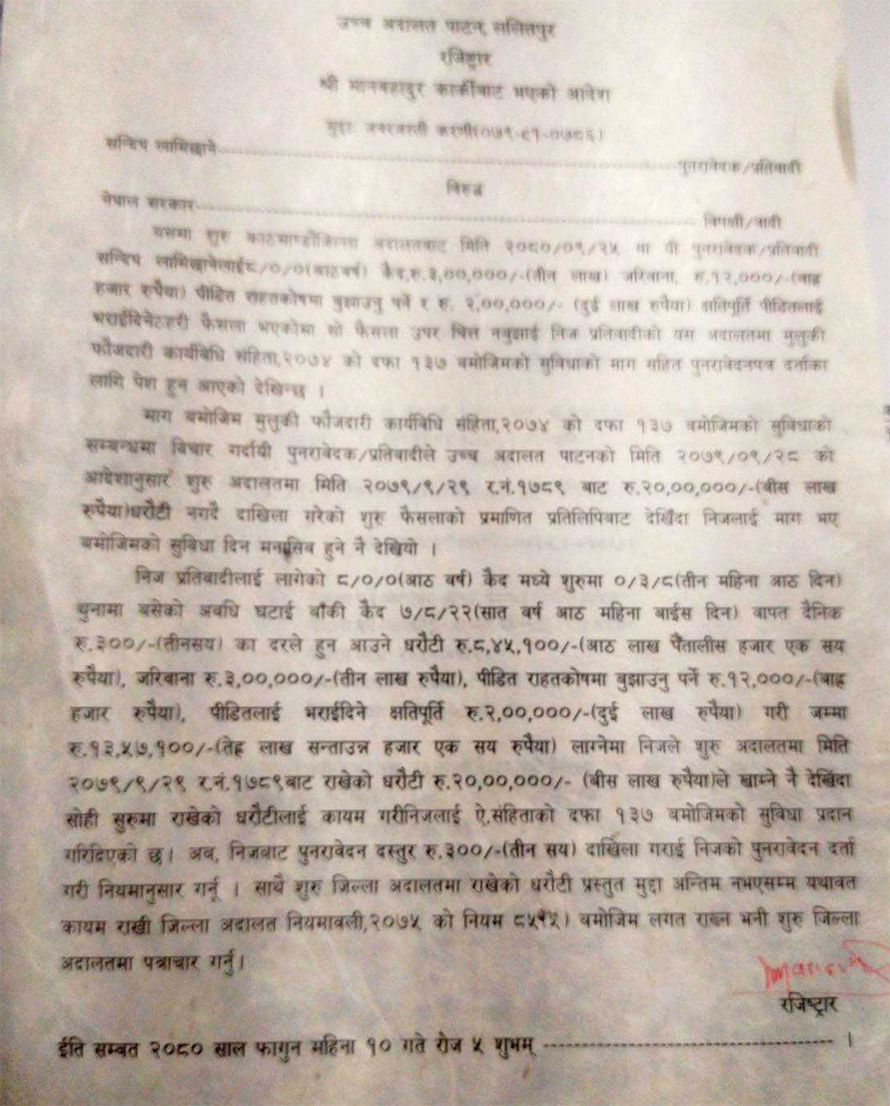 सन्दीपलाई जेलबाहिर बसेर मुद्दा लड्न उच्च अदालतको अनुमति