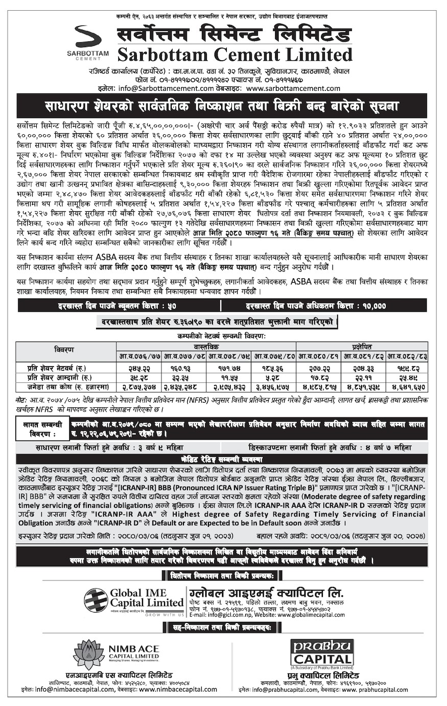 सर्वोत्तम सिमेन्टले पहिलो पटक बुक बिल्डिङमार्फत सर्वसाधारणलाई फागुन १३ गतेगतेदेखि कुल २७ लाख ७६ हजार ७६ कित्ता आइपीओ निष्कासन तथा बिक्री खुला गरेको हो। कम्पनीले उद्योग प्रभावित क्षेत्रका स्थानीय बासिन्दा, वैदेशिक रोजगारीमा रहेका नेपाली, कर्मचारी तथा सामूहिक लगानी कोषलाई सेयर बाँडफाँट गरी बाँकी रहेको सेयर सर्वसाधारणलाई बिक्री खुला गरेको छ।