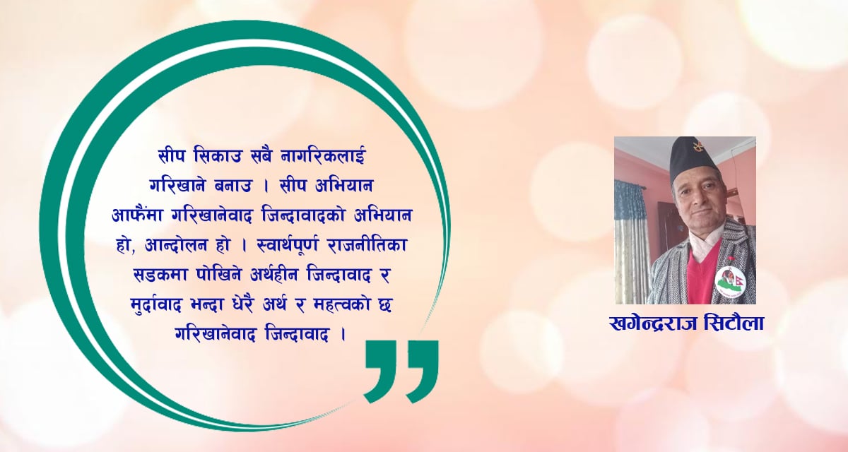 सीप सिकाउ सबै नागरिकलाई गरिखाने बनाउ। सीप अभियान आफैंमा गरिखानेवाद जिन्दावादको अभियान हो, आन्दोलन हो। स्वार्थपूर्ण राजनीतिका सडकमा पोखिने अर्थहीन जिन्दावाद र मुर्दावाद भन्दा धेरै अर्थ र महत्वको छ गरिखानेवाद जिन्दावाद।