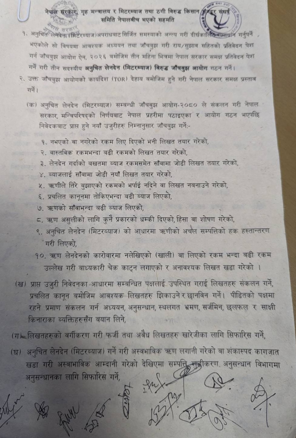 सहमतिपत्रमा आयोगको कार्यादेशअनुसार जाँचबुझ गरी सरकारसमक्ष प्रस्ताव पेस गर्ने, आर्थिक समस्याका कारण मिटरब्याजी साहु, महाजनका चङ्गुलमा पर्न नदिन शोषित उत्पीडित वर्गलाई आर्थिक सहायता, राहत र क्षतिपूर्तिका लागि आगामी बजेटमा आवश्यक व्यवस्था मिलाउन अर्थ मन्त्रालयलाई अनुरोध गर्ने र मिटरब्याज तथा ठगीविरुद्ध किसान मजदुर संघर्ष समितिका तर्फबाट हाल चलिरहेको आन्दोलनका कार्यक्रम स्थगित गर्ने उल्लेख छ।