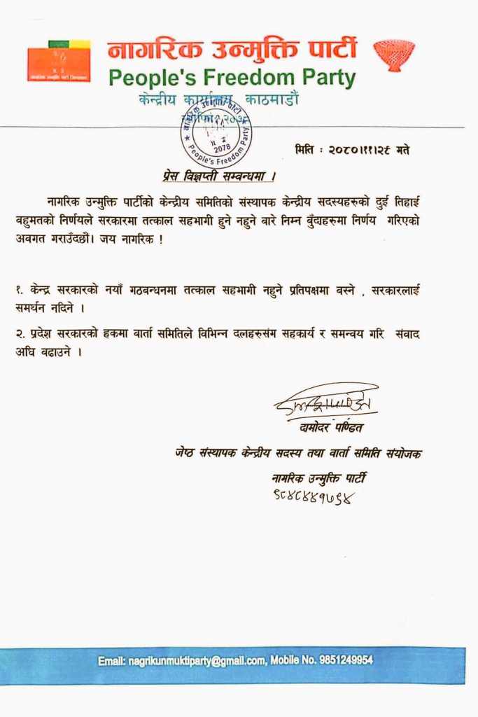 यता नागरिक उन्मुक्तिका ज्येष्ठ संस्थापक केन्द्रीय सदस्य एवं वार्ता टोलीका संयोजक दामोदर पण्डितले विज्ञप्ति प्रकाशित गरी अहिले पार्टी संघीय सरकारमा नजाने र प्रतिपक्षमा बस्ने जनाएका छन्।
