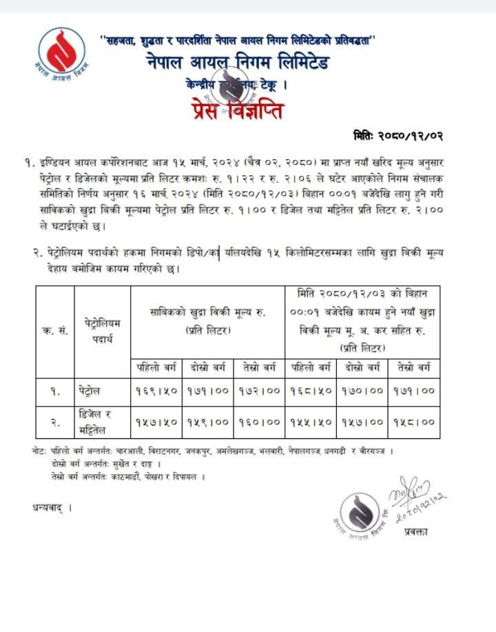 निगमका अनुसार नयाँ मूल्यसूची आज राति १२ बजेदेखि लागू हुनेछ।