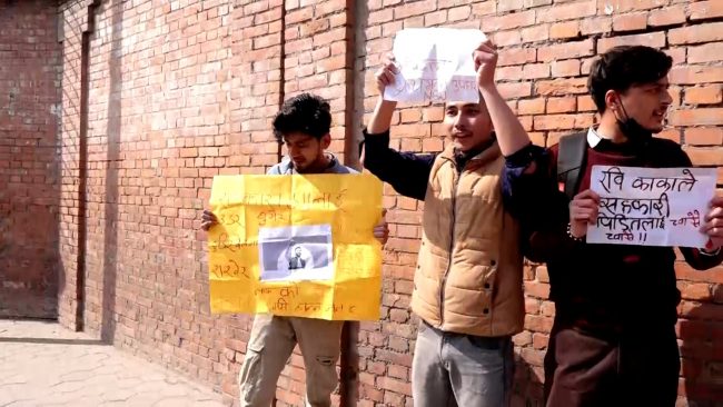 काठमाडाैं। उपप्रधानमन्त्री एवम् गृहमन्त्री रवि लामिछानेलाई पदबाट हटाउनुपर्ने माग गर्दै नेपाल विद्यार्थी संघ (नेविसंघ)ले सिंहदरबार परिसरमा प्रदर्शन गरेका छन्।