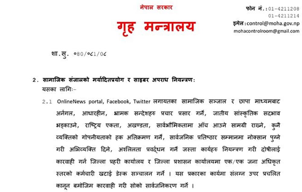 सार्वजनिक भएको निर्देशनमा अनलाइन न्युज पोर्टल, फेसबुक, ट्विटर लगायतका सामाजिक सञ्जाल र छापा माध्यमबाट अनर्गल, आधारहीन, भ्रामक सन्देशहरू प्रचार प्रसार गर्ने, जातीय सांस्कृतिक सद्भाव भड्काउने, राष्ट्रिय एकता, अखण्डता, सार्वभौमिकतामा आँच आउने सामग्री राख्ने, कुनै व्यक्तिको गोपनीयताको हक अतिक्रमण गर्ने, सार्वजनिक प्रतिष्ठा र सम्मानमा नोक्सान पुग्ने गरी अभिव्यक्ति दिने, अश्लिलता प्रवर्द्धन गर्ने जस्ता कार्यहरू नियन्त्रण गरी दोषीलाई कारबाही गर्न जिल्ला प्रहरी कार्यालय र जिल्ला प्रशासन कार्यालयमा एकरएक जना अधिकृतस्तरको कर्मचारी खटाई डेस्क सञ्चालन गर्ने उल्लेख छ । यसैगरि यस प्रकारका कार्यमा संलग्न उपर प्रचलित कानुन बमोजिम कारबाही गरी सोको सार्वजनिकरण गर्ने समेत उल्लेख छ ।
